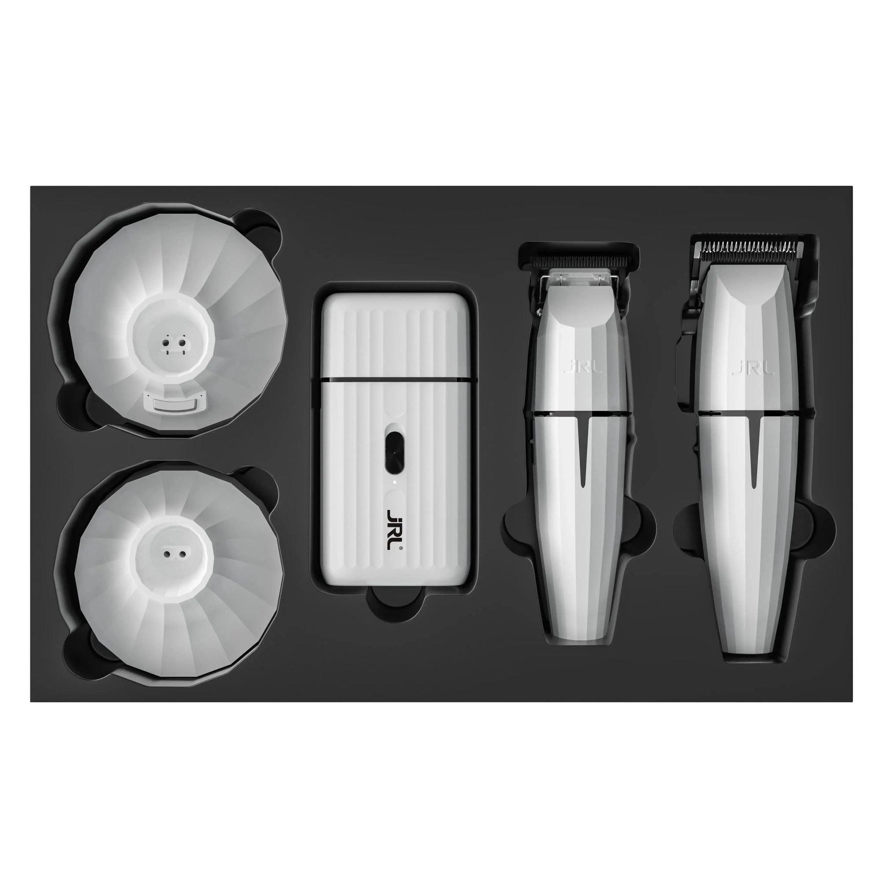 JRL Ghost Collection #2 inkluderar en premium klippare, trimmer och rakhyvel – alla designade för professionell prestanda och precisionsvård. Setet levereras komplett med två laddningsdockor, ett EZ-M GAP trimmerblad, en uppsättning kamguider, justeringsverktyg för blad, skruvmejsel, bladskydd, smörjolja och en rengöringsborste.
